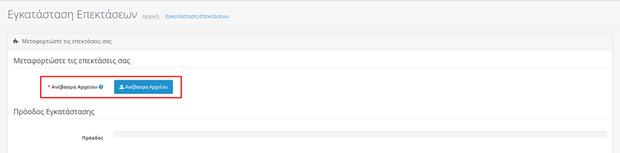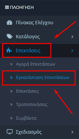 Για να εγκαταστήσουμε το plugin στο διαχειριστικό μας πηγαίνουμε Επεκτάσεις -> Εγκατάσταση Επεκτάσεων.