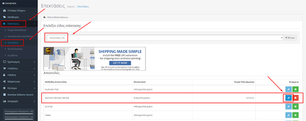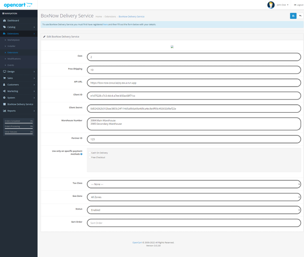 Στη συνέχεια πηγαίνουμε από το διαχειριστικό μας Επεκτάσεις -> Επεκτάσεις -> Αποστολές -> BoxNow Delivery Services και εμφανίζεται το παρακάτω menu για να αρχίζετε να συμπληρώνεται τα πεδία σύμφωνα με τις πληροφορίες - κωδικούς που σας έχουν δοθεί από εμάς:
