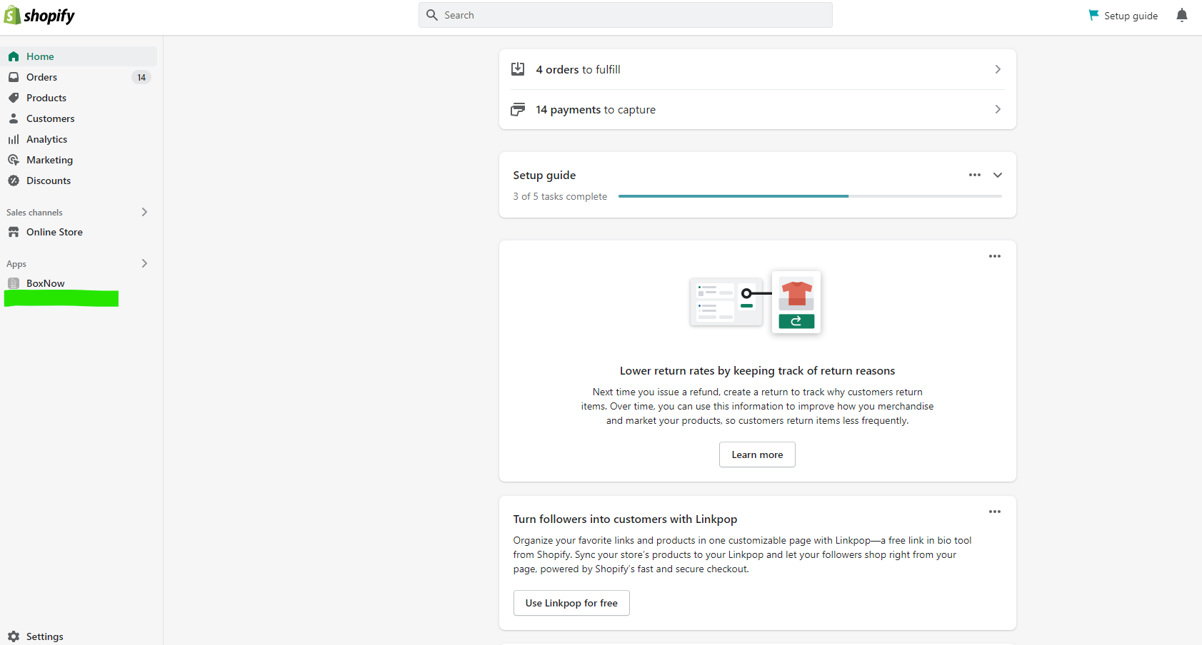 BoxNow - Automated process for BoxNow parcel delivery lockers. | Shopify App StoreΣτη συνέχεια στο διαχειριστικό του Shopify στην κατηγορία app θα εμφανιστεί η επιλογή της BOX NOW.
