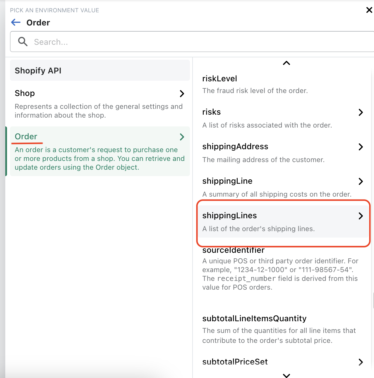 Στο νέο μενού που θα εμφανιστεί, πατήστε στο θέμα Order και μετά σκρολάρετε στα πεδία του που θα εμφανιστούν δεξιά, μέχρι να βρείτε το πεδίο “shippingLines”.