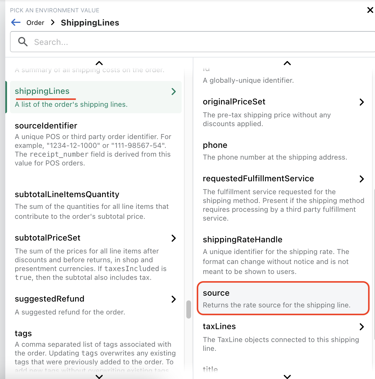 Μετά, σκρολάρετε στα πεδία του shippingLines στα δεξιά και πατήστε πάνω στο source.