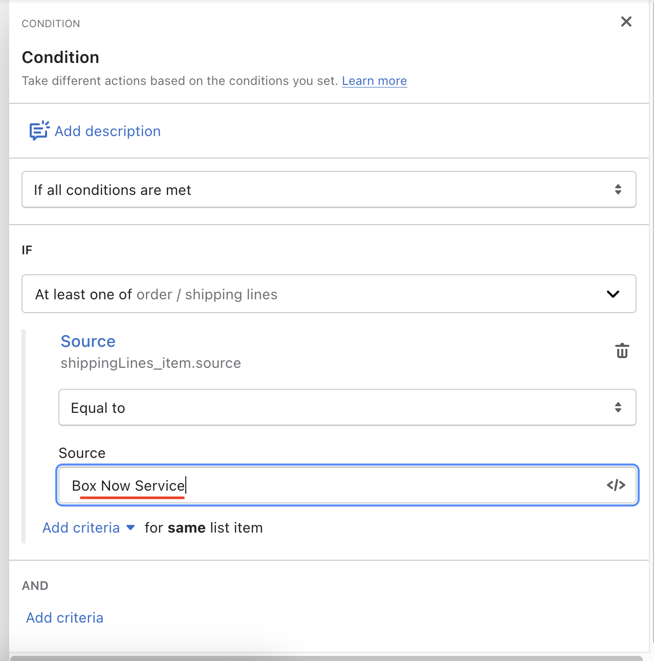 Τέλος, πατήστε εκεί που λέει “Enter source” και πληκτρολογήστε “Box Now Service”.
