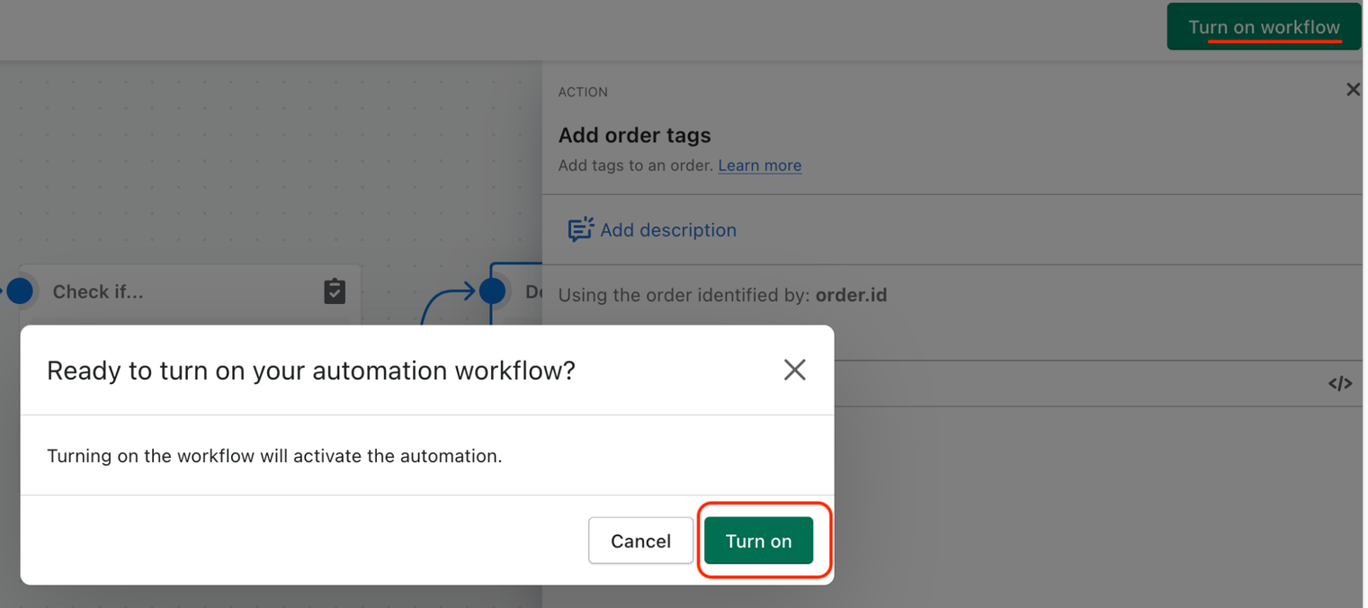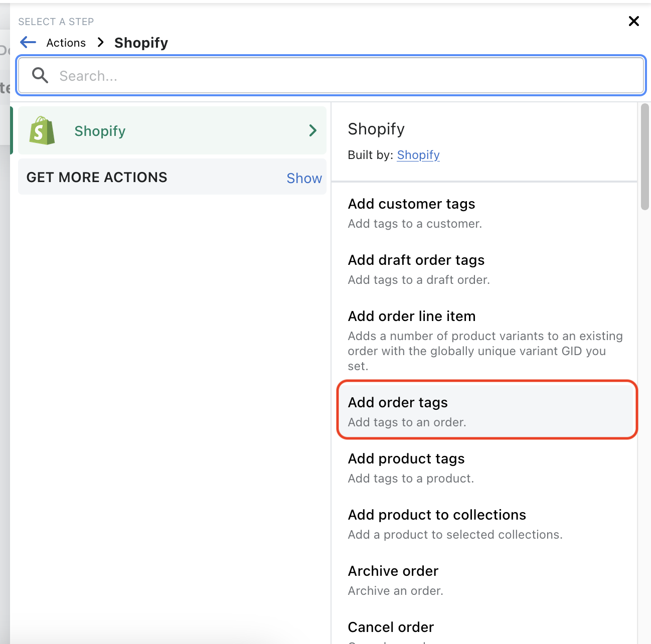 Εδώ, θα ρυθμίσετε την διαδικασία που θα εκτελείται όταν ισχύει η παραπάνω συνθήκη. Στο μενού που θα εμφανιστεί στα δεξιά, μπορείτε ήδη να δείτε και να πατήσετε το action “Add order tags”, αλλιώς αναζητήστε το στο Search και πατήστε το.