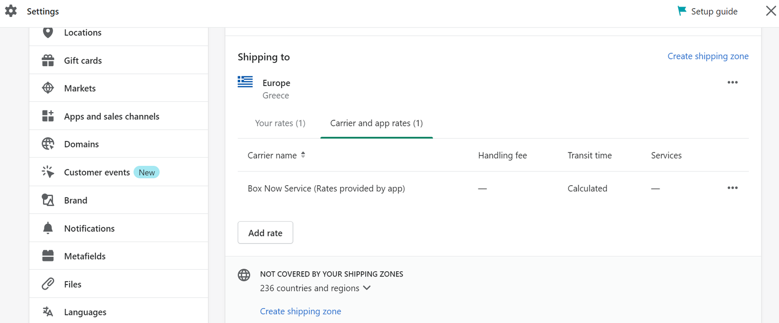 Settings → Shipping and delivery → Manage → Carrier and app rates