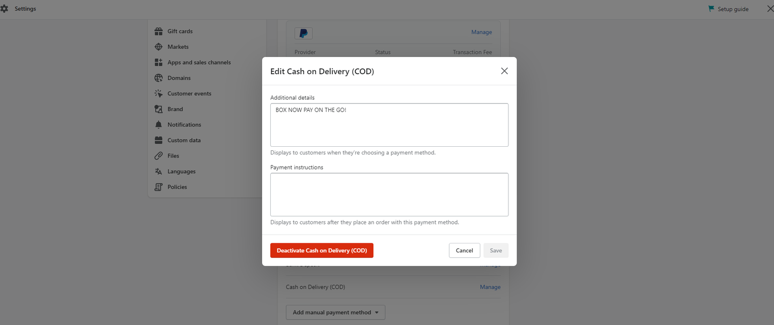 Για να εμφανιστεί το λεκτικό της αντικαταβολής στο checkout, θα χρειαστεί συμπληρωματικά να καταχωρηθεί και στις ρυθμίσεις των πληρωμών. Settings → Payments → Cash on Delivery (COD) → Manage → Additional details. Στην συνέχεια καταχωρούμε το λεκτικό που έχουμε γράψει στην παραμετροποίηση του app.