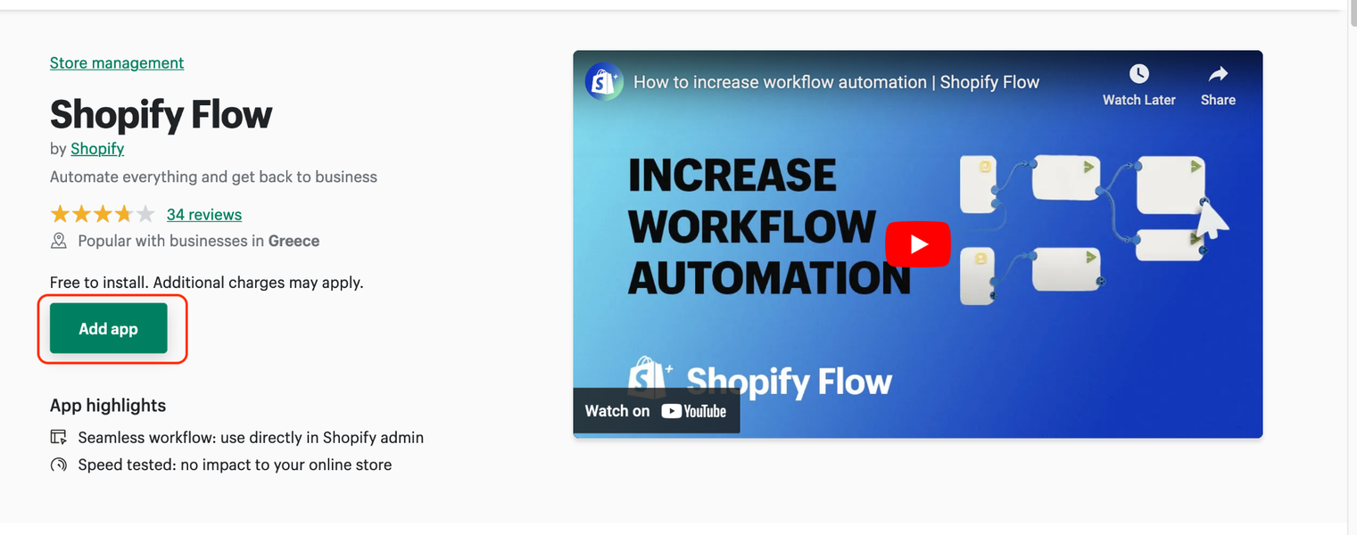 Στη συνέχεια, πατάμε το κουμπί που λέει Search for “Shopify Flow” in the Shopify App Store και αφήνουμε τον περιηγητή να μας πάρει στο app store του Shopify. Από την καινούρια σελίδα που έχει ανοίξει, πατάμε το Shopify Flow by Shopify.