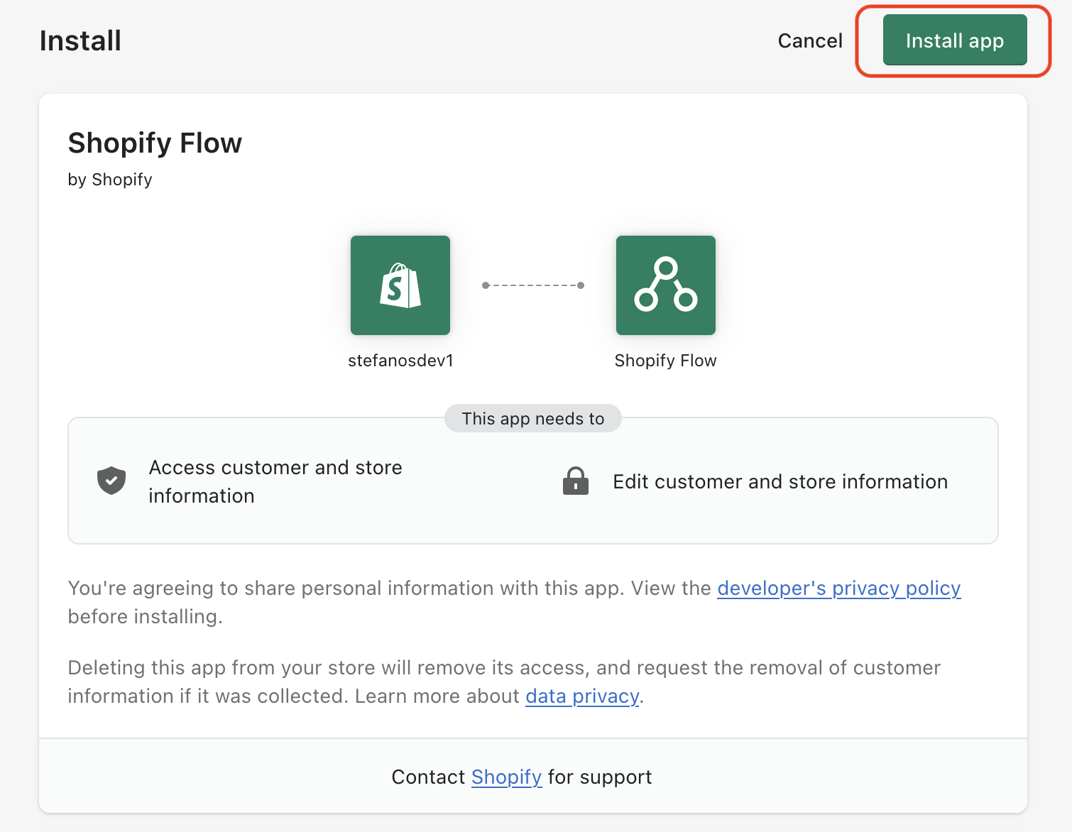 και μετά Install app για να εγκατασταθεί η εφαρμογή στο Shopify store σας. Πλέον η εφαρμογή έχει ρυθμιστεί στο μαγαζί σας και μπορείτε να τη βρείτε στην περιοχή των Apps σας.